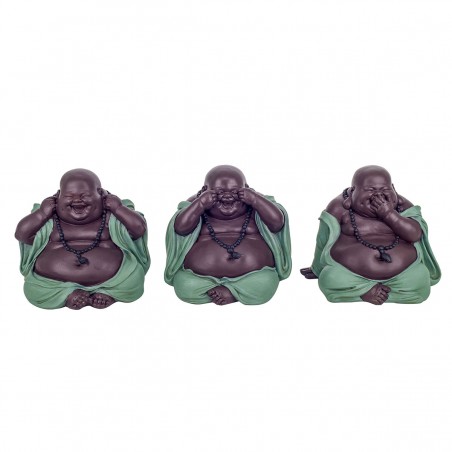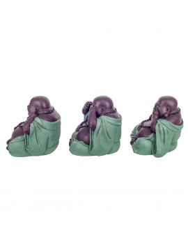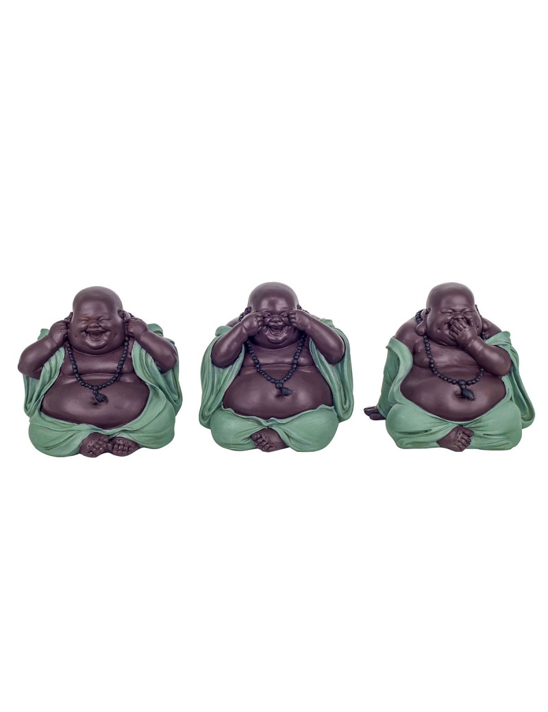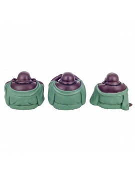 Décoration Zen un Set de 3 Statues de Bouddha rieur j'ai rien Vu, Entendu, Dit de couleur Gris et Bleu pétrole.