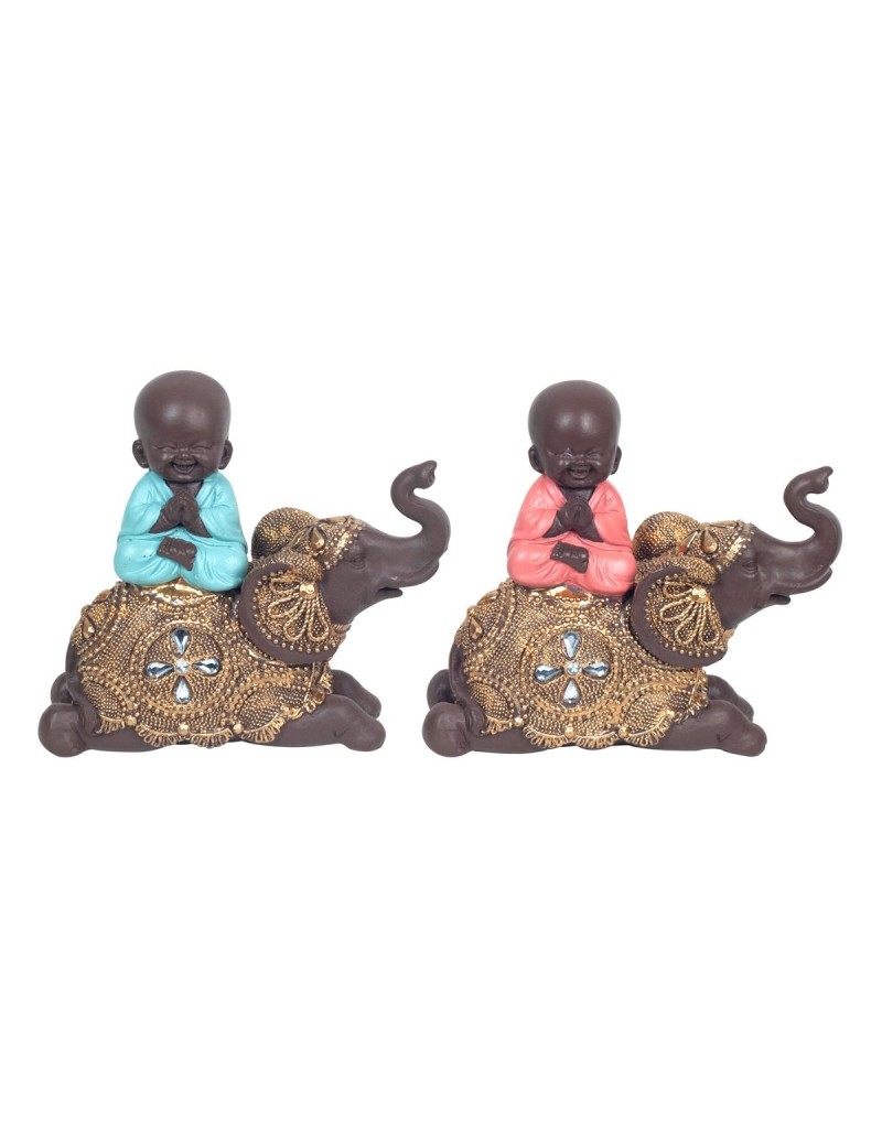 Statuette 17 cm moine bouddha rose ou turquoise sur éléphant zen, résine