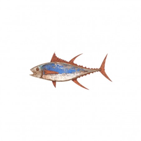 Une décoration murale neuve en bois & métal, à suspendre de 30cm de longueur, d'un poisson effet vieilli vintage.