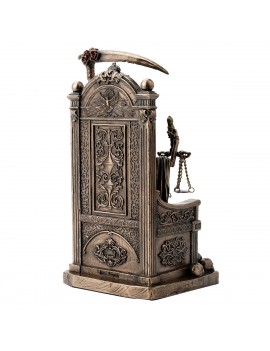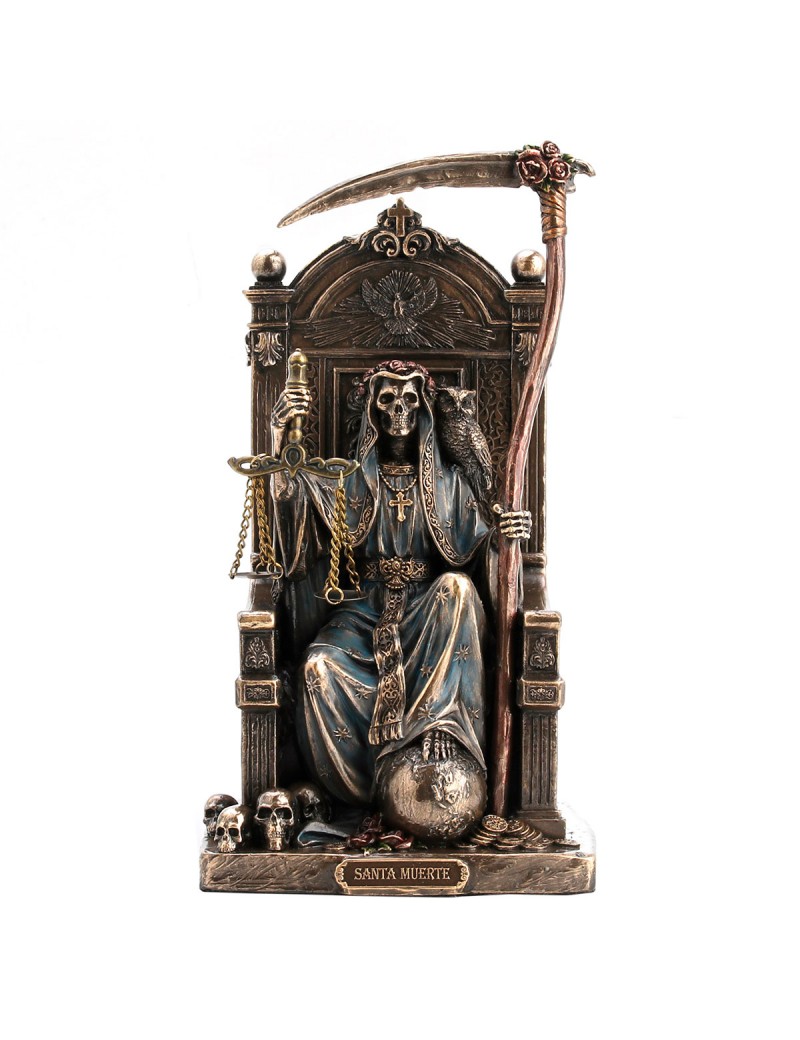 Statue Décoration Mythologie, Santa Muerte la grande Faucheuse sur son trône finement décoré avec sa Faux et Balance.