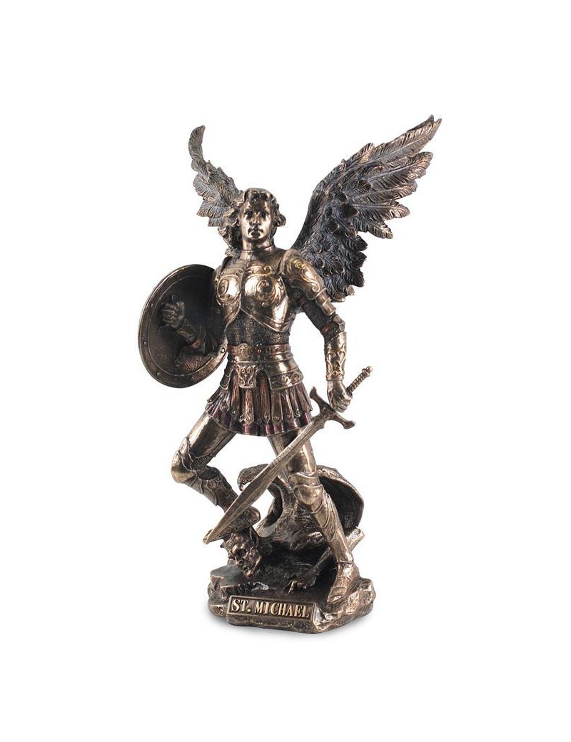 Une statue décoration neuve de l'archange St Michel, en polyrésine de couleur bronze laiton à la finition remarquable.