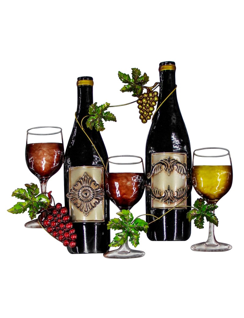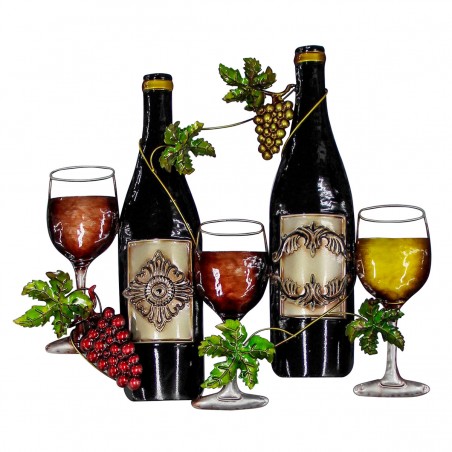 Décoration murale d'intérieur Vin Cave Bistrot Dégustation, une applique entièrement en Métal Bouteilles Verres Grappes vignes.