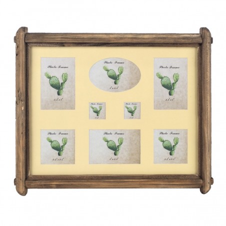Décoration d'Intérieur style Maison de Campagne, un Cadre pêle-mêle mural pour 8 photos à suspendre en Bois design rustique couleur naturel et fond couleur paille.