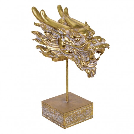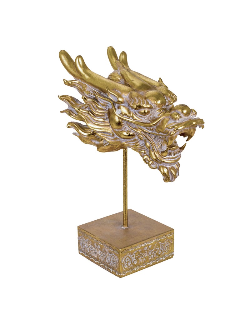 Décoration d'Intérieur Inspiration Chine, une Tête de Dragon couleur Dorée sur socle d'une taille de 39cm de hauteur.