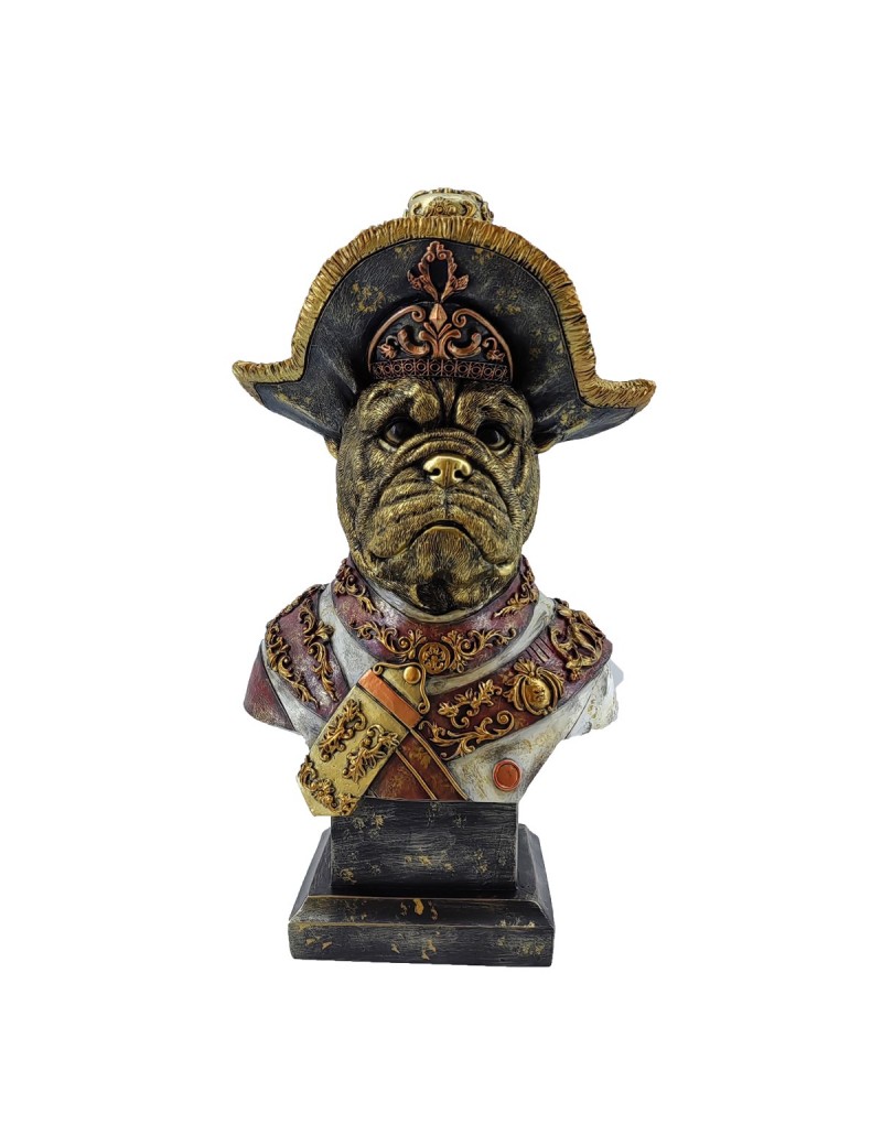 Statue Décoration Buste de Bouledogue avec Chapeau et tenue Empire sur socle 36x20cm