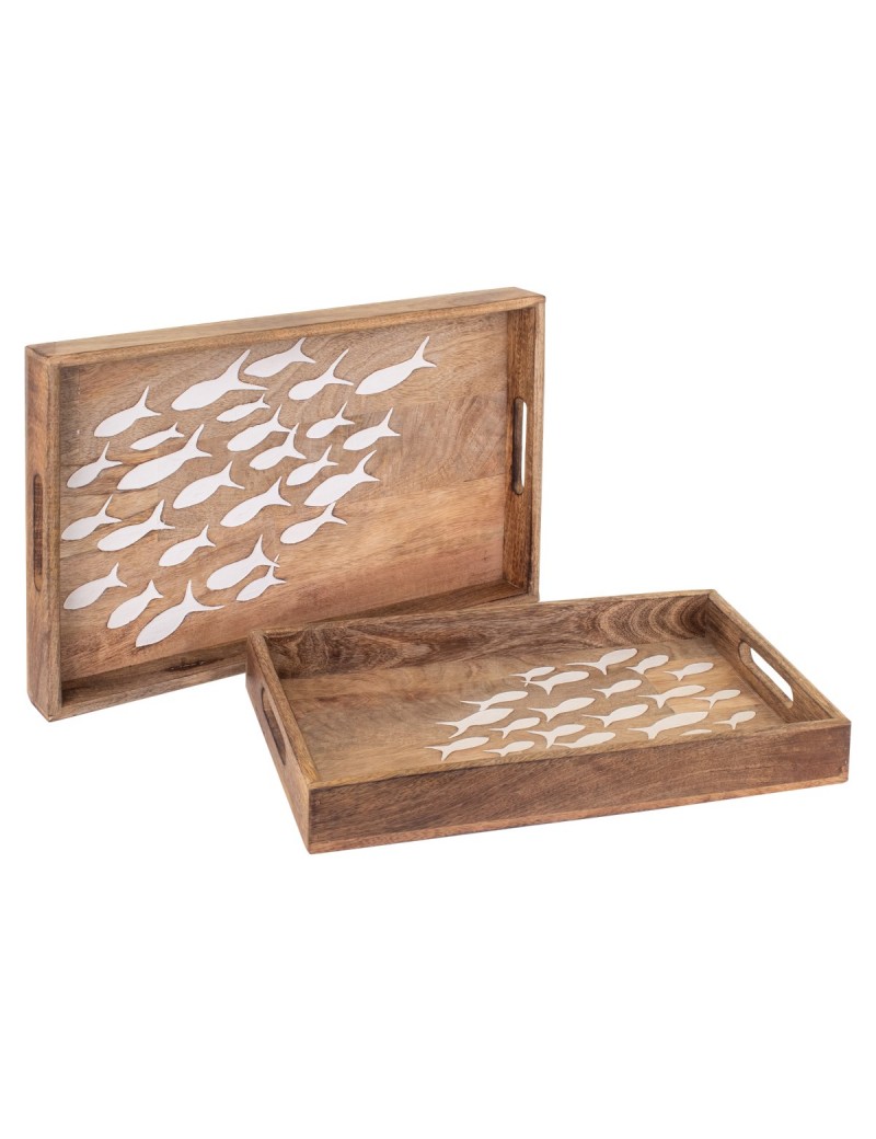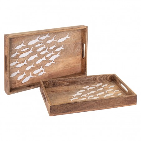 Décoration Art de la table, un Set de 2 plateaux en Bois rectangulaire gigogne couleur Naturel ornement Poissons blanc.