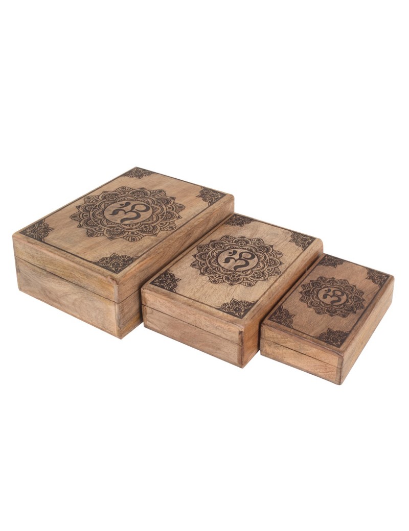 Décoration d'Intérieur pratique, un Set de 3 Boites Gigognes en Bois avec ornement Mandala Om.