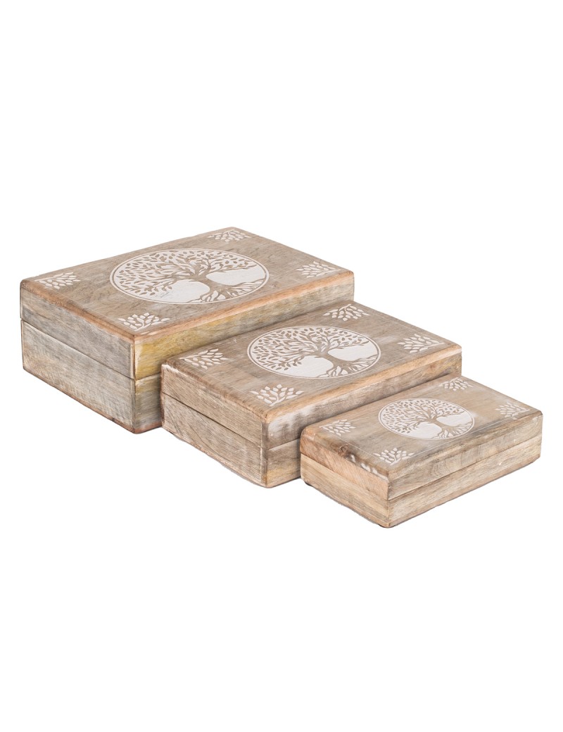 Boites Gigognes en Bois couleur Naturel Set de 3 avec couvercle Déco Ornement Arbre de Vie.