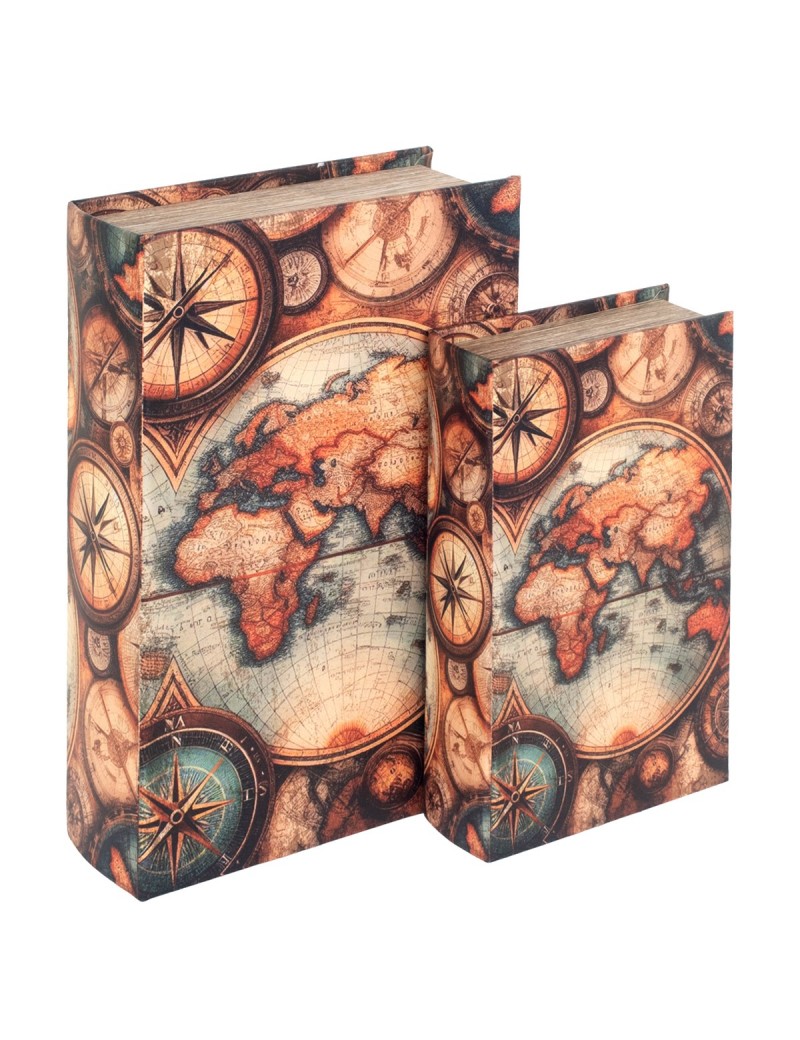 Boite forme de Livre Set de 2 Décoration Carte du Monde Boussole 27cm.