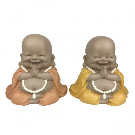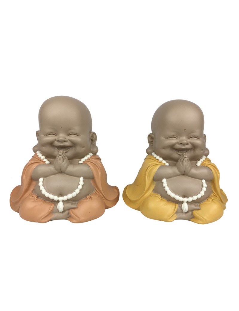 Statue Décoration Zen, Bouddha rieur assis mains jointes, tenue couleur Caramel ou jaune Moutarde.