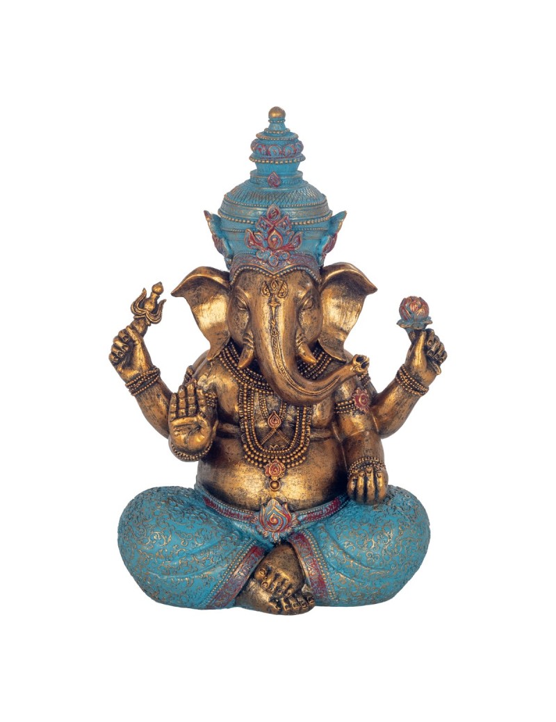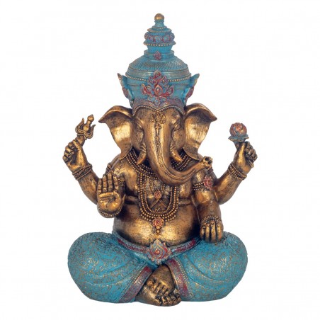 GANESH Assis Statue Décoration de 26cm couleur Bleu Doré Cuivre