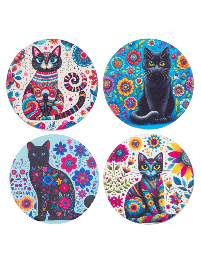 Sous-verre rond en Céramique de 11cm Décoration Chat Noir et Fleurs