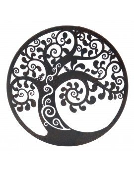 Décoration d'Intérieur, une applique murale ronde en métal à suspendre de couleur Noire, Arbre de vie avec oiseaux.