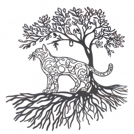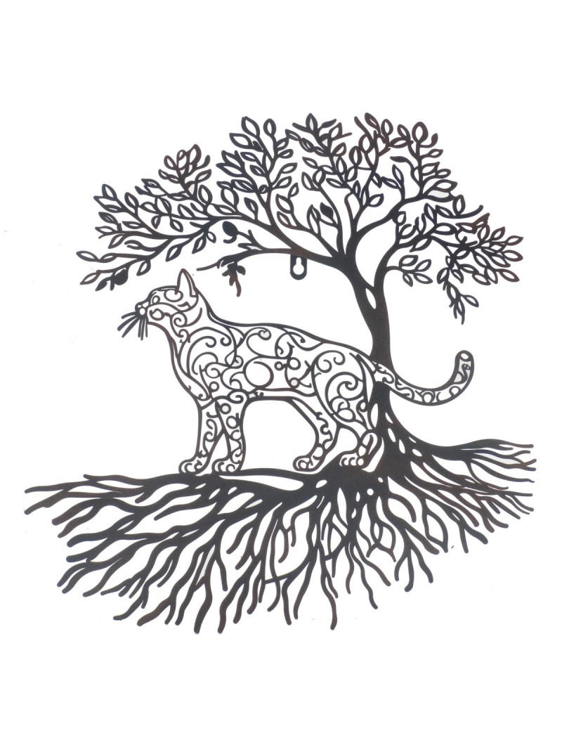 Chat félin au Design ethnique sous un arbre avec racines, Décoration murale en métal à suspendre.