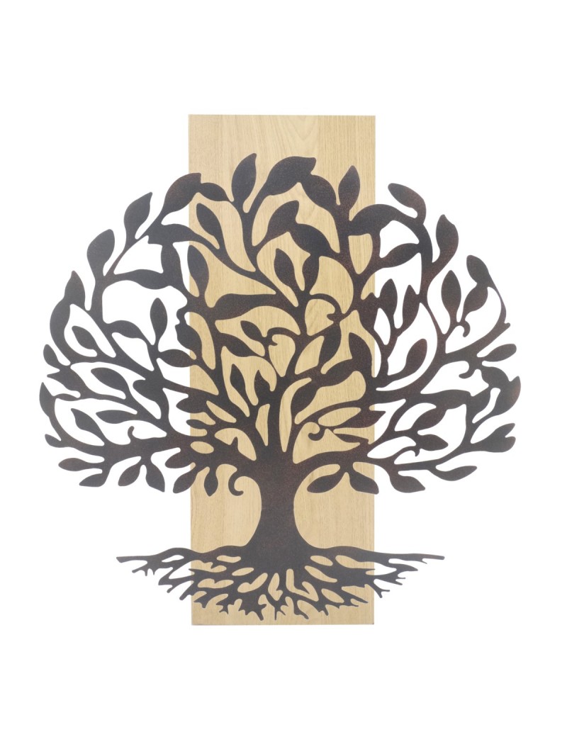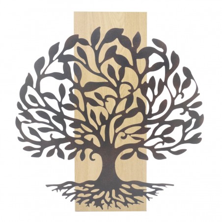 Déco murale d'Intérieur, Arbre de vie à suspendre en métal couleur Noir Brun, fond couleur Bois de 60cm.