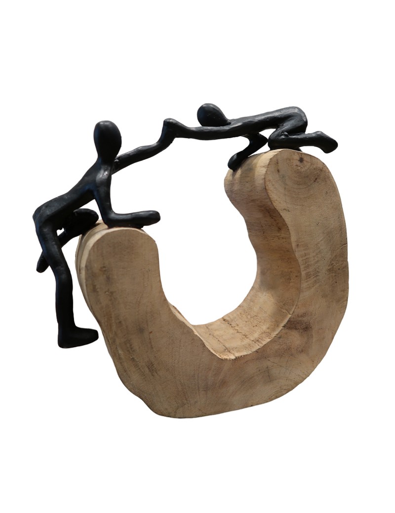 Statue déco, couple en métal symbolisant l'entraide sur un socle tronc en bois.