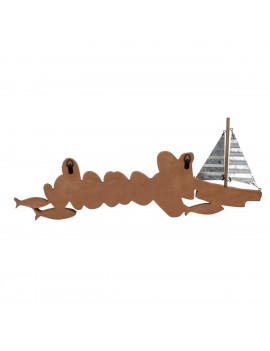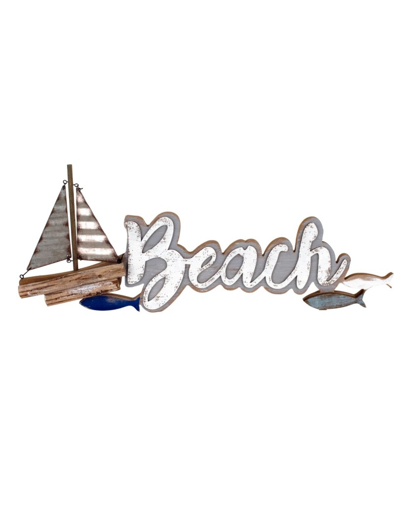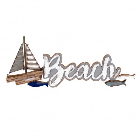Enseigne Décoration Murale Beach Plage en Bois avec Voilier et Poissons