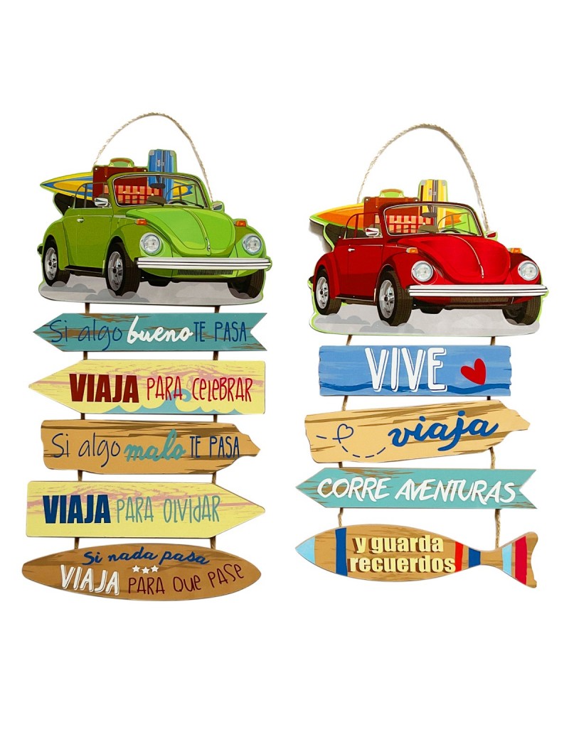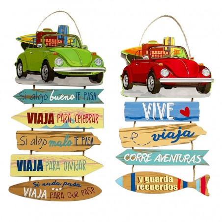 Décoration murale Vacances panneau enseigne en bois et corde à suspendre, voiture décapotable vintage coccinelle avec écritures en espagnol.