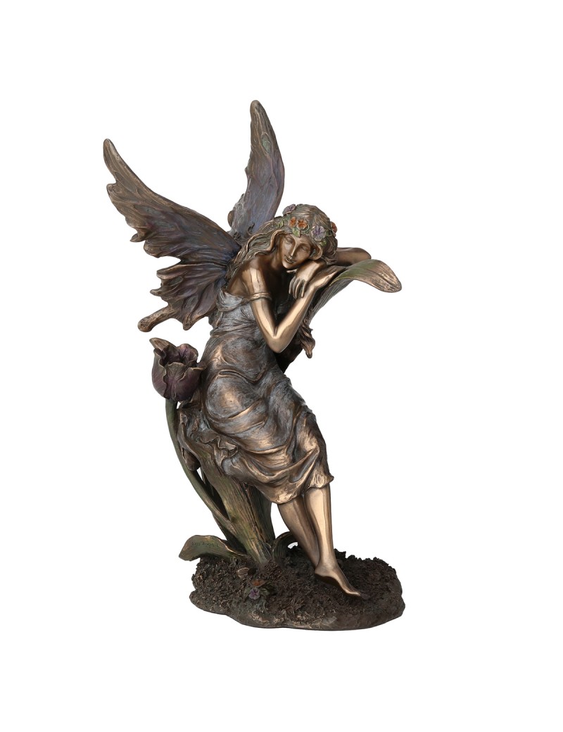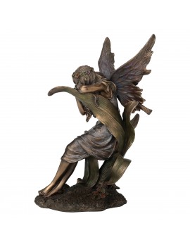 Décoration collection Fantasy, une statue de Fée assise endormie sur une fleur couleur Brun Bronze de 22cm.
