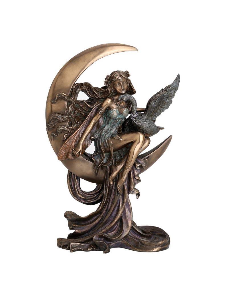 Statue décoration d'Intérieur, une Fée assise sur un croissant de Lune avec une Oie sur les genoux, en résine couleur Bronze cuivré.