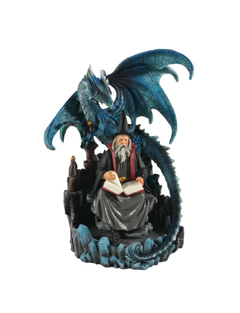 Décoration collection Fantasy, Statue de Magicien Sorcier assis avec grimoire et 1 Dragon de couleur principale Bleu.