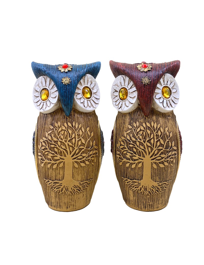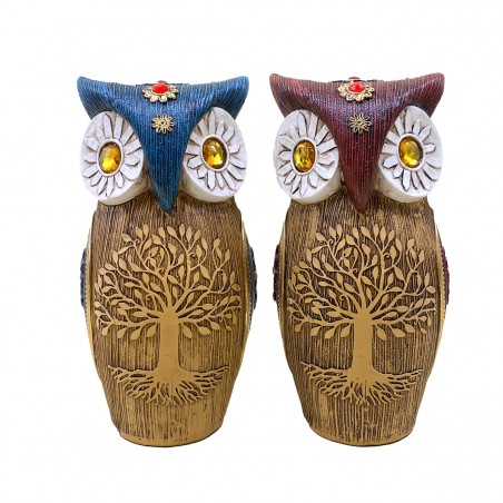 Décoration Collection Chouette, statue Hibou tête Bordeaux et Bleu Design Arbre de Vie en relief sur le corps.