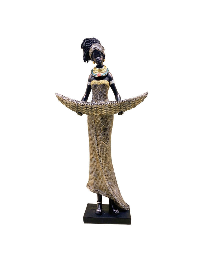 Décoration Inspiration Afrique, une Statue vide poche de 47cm d'une Femme portant un panier.