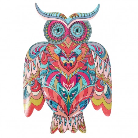 Chouette Hibou collection, Plaque murale à suspendre de 23cm aux motifs ethniques couleur Rouge Orange Ciel.