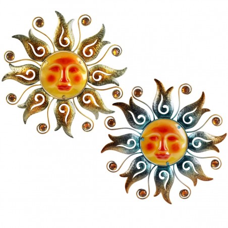Une décoration murale neuve ornement soleil de couleur dorée ou azur, à suspendre, entièrement en métal pour une touche d'originalité effet sud.
