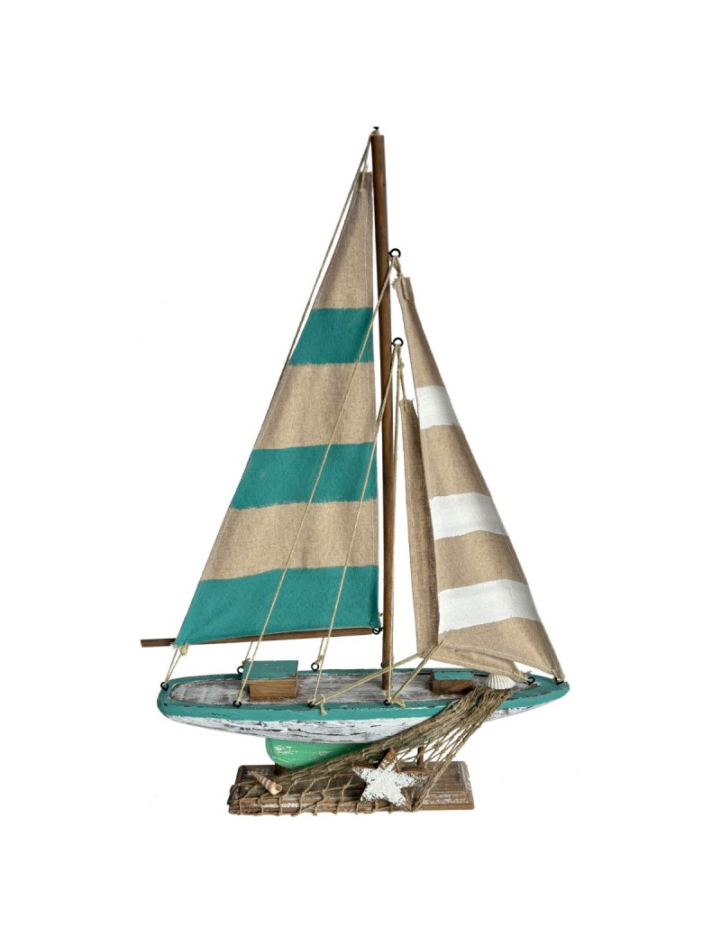 Décoration Bord de Mer Océan, Voilier en bois sur socle effet vieilli couleur Sable et Vert de hauteur 63cm.