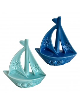 VOILIER Décoration en céramique de 14cm couleur Bleu Ciel et Marine