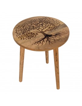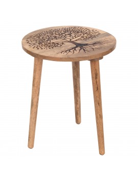 Décoration pratique, une table d'appoint en bois couleur naturel avec 3 pieds et un plateau rond Design Arbre de Vie.