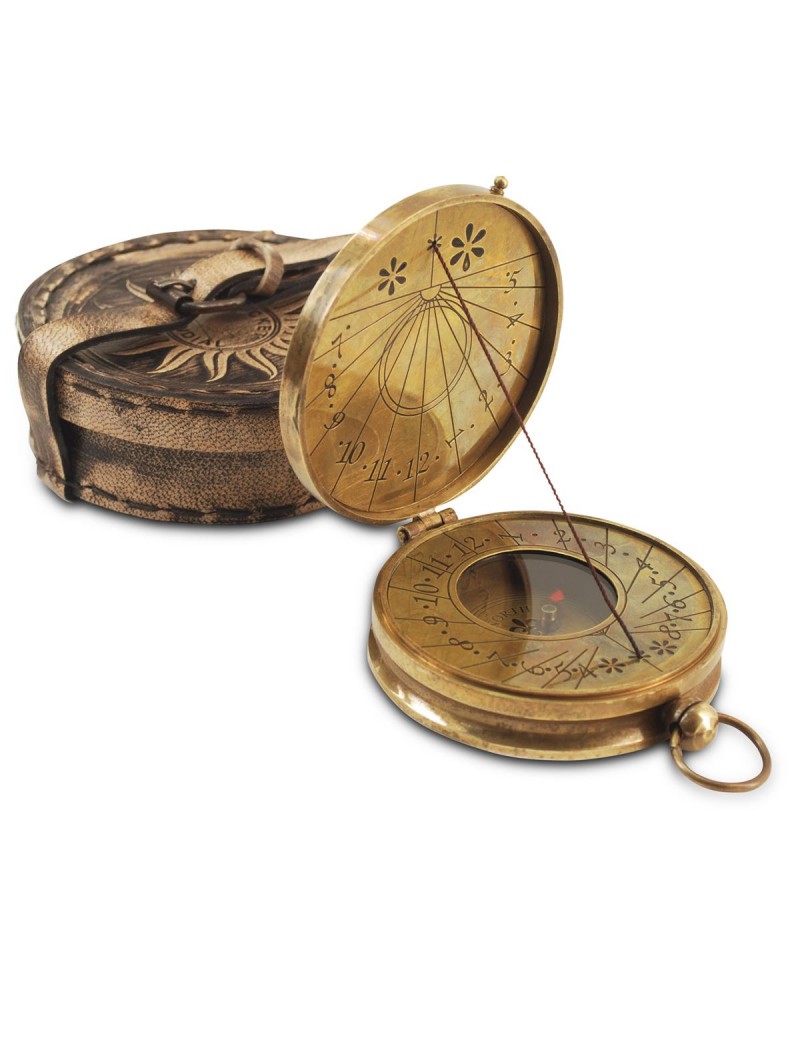 Une boussole neuve en laiton, design rétro vintage, dans sa boite de présentation ornement soleil.