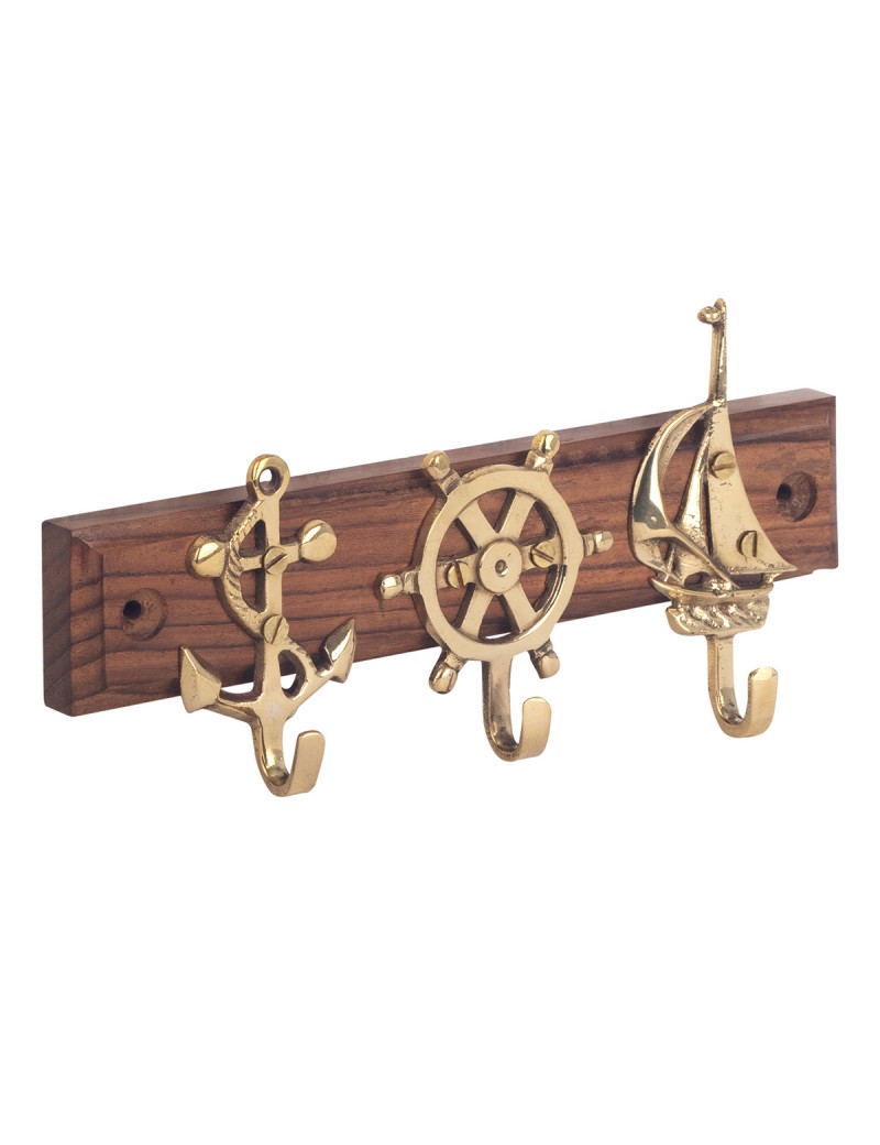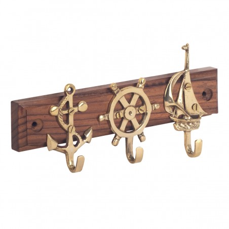 Décoration collection Objet Marin rétro, Patère en bois et laiton 3 crochets Ancre Gouvernail Voilier.