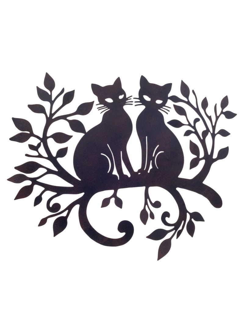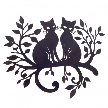 Décoration murale originale en métal couleur Brun Noir, couple de Chat sur une branche.