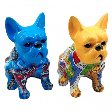 BOULEDOGUE Statue Décoration Design Graffiti de 16cm Bleu et Jaune.