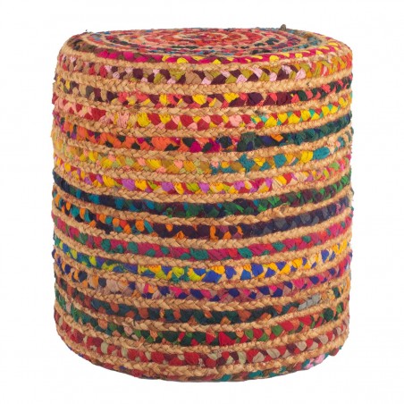 Un Pouf rond de hauteur 40cm en Jute couleur Naturel avec ornement coton en Couleur lumineuse.
