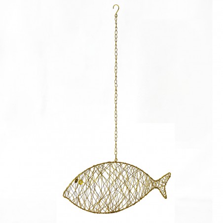 Décoration style Atelier Industriel, un Poisson entièrement en métal en relief de couleur dorée à suspendre.
