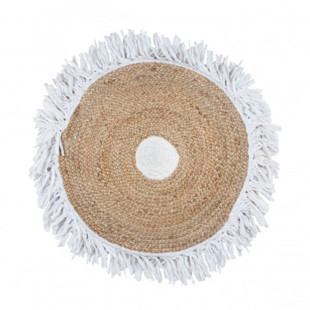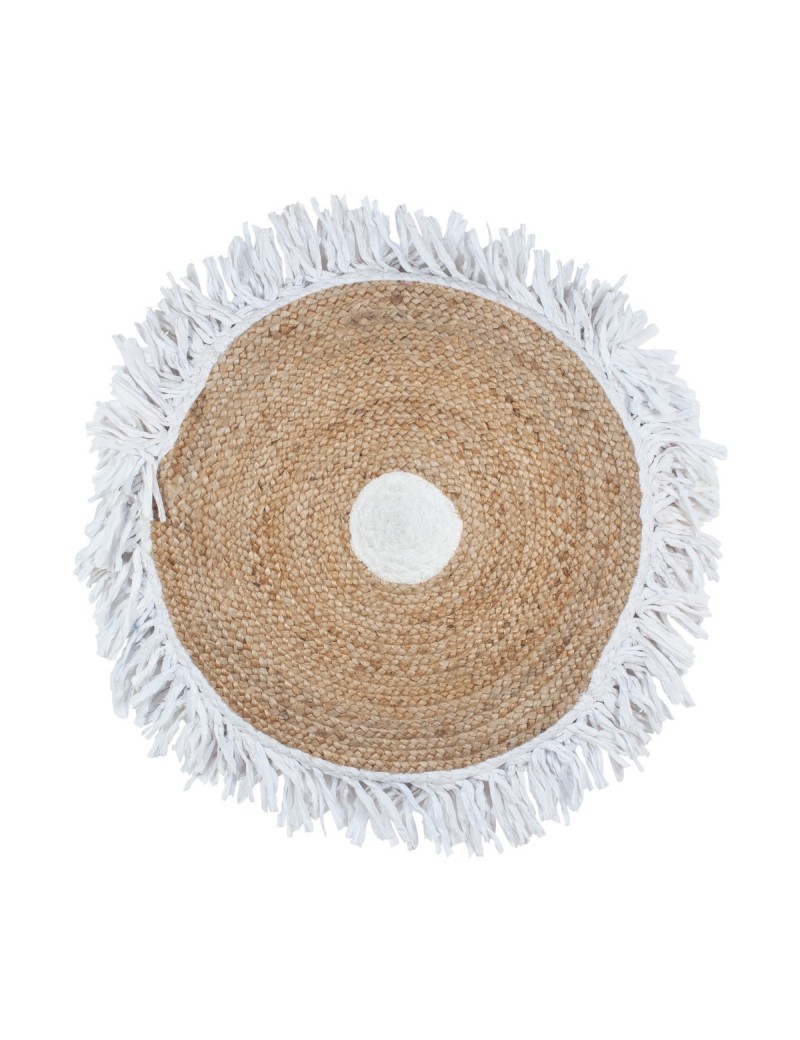 TAPIS Rond en JUTE tressé couleur naturel et franges blanches 90cm