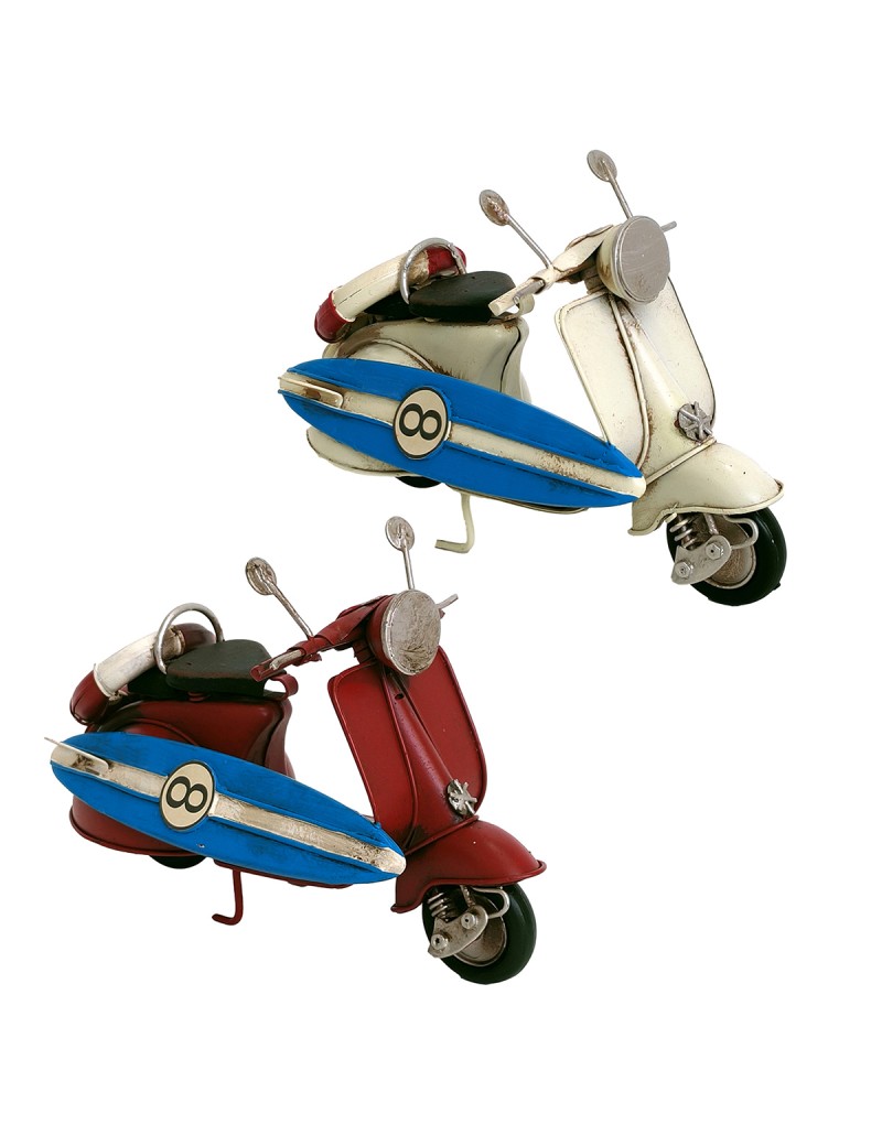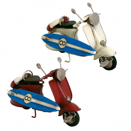Décoration Mer Océan Plage Vacances rétro, un Scooter miniature en métal avec une Planche de Surf et une bouée.