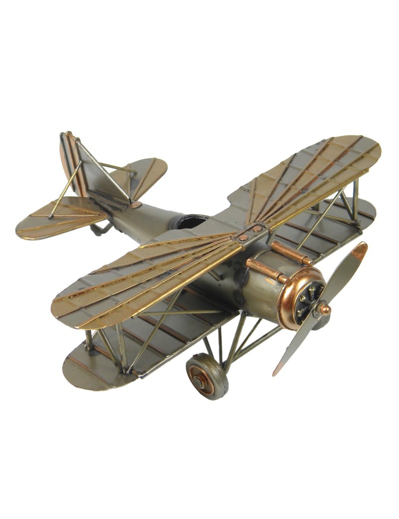 Décoration collection Vintage rétro, miniature d'un avion biplan en métal couleur Gris kaki et Or cuivré.
