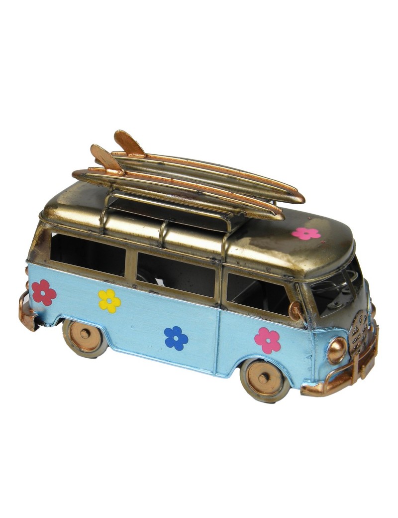 Décoration collection Vintage 60's vacances surf à la plage, miniature d'un Van Camper en métal bicolore Ciel et Doré.