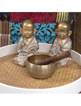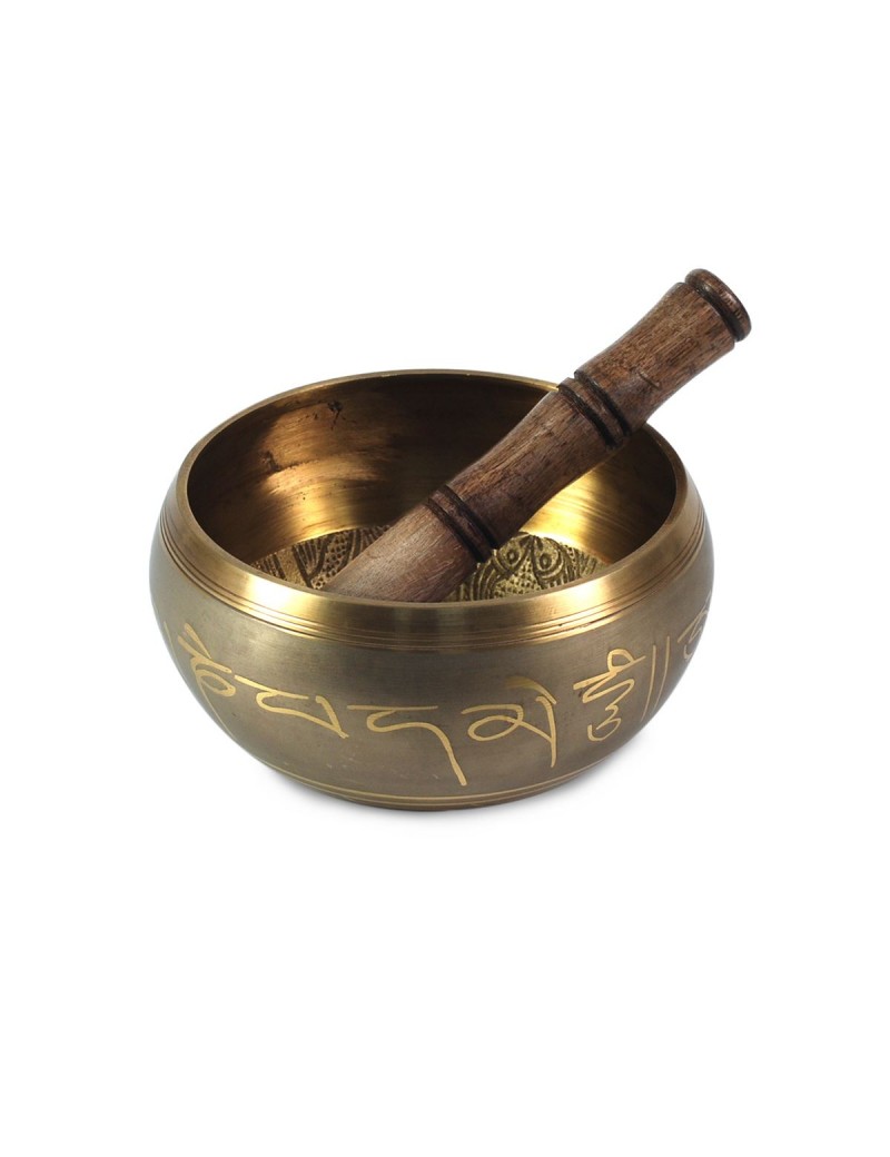 Un bol Tibétain neuf en métal doré avec gravure intérieure Bouddha & son maillet bois, pour la MÉDITATION.