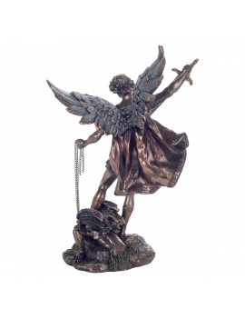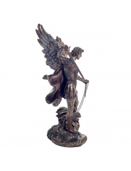 Une statue neuve en polyrésine couleur bronze laiton, représentant l'archange Saint Michel. Une statue neuve d'une taille de 28cm de hauteur, 16cm de largeur pour 11cm de profondeur pour un poids de 800grs.