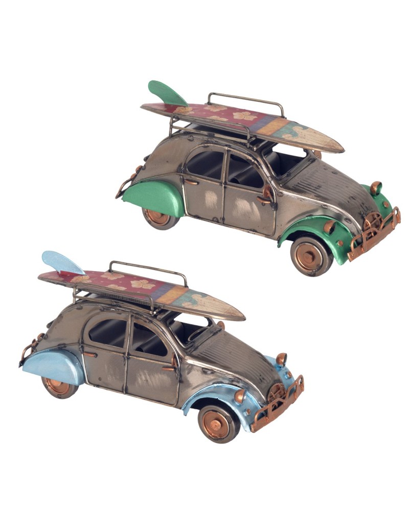 Voiture Miniature en métal rétro 2CV bicolore de 17cm avec Surf sur le toit